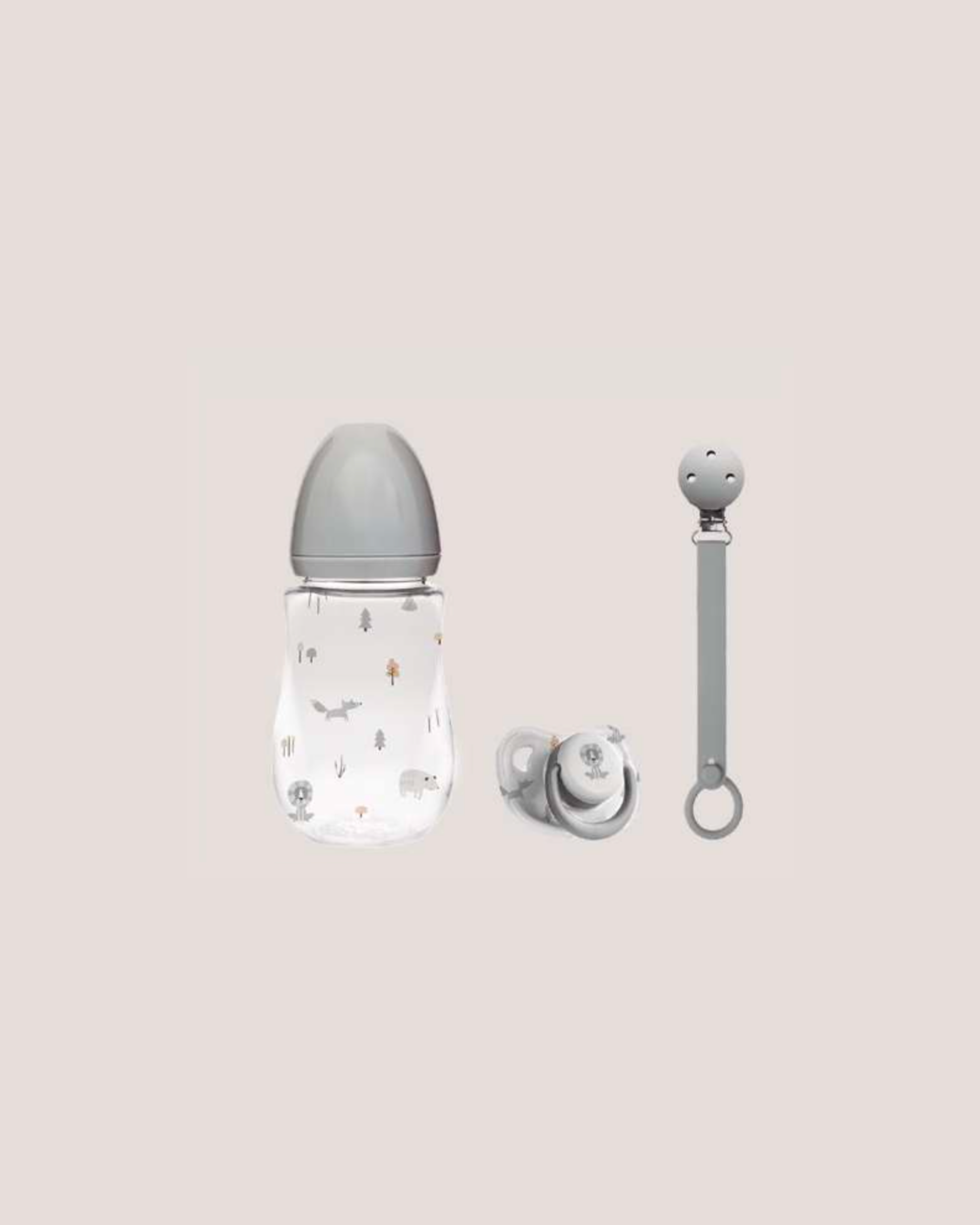 - Baby bottle, pacifier, and clip are crafted from 100% silicone, BPA-free