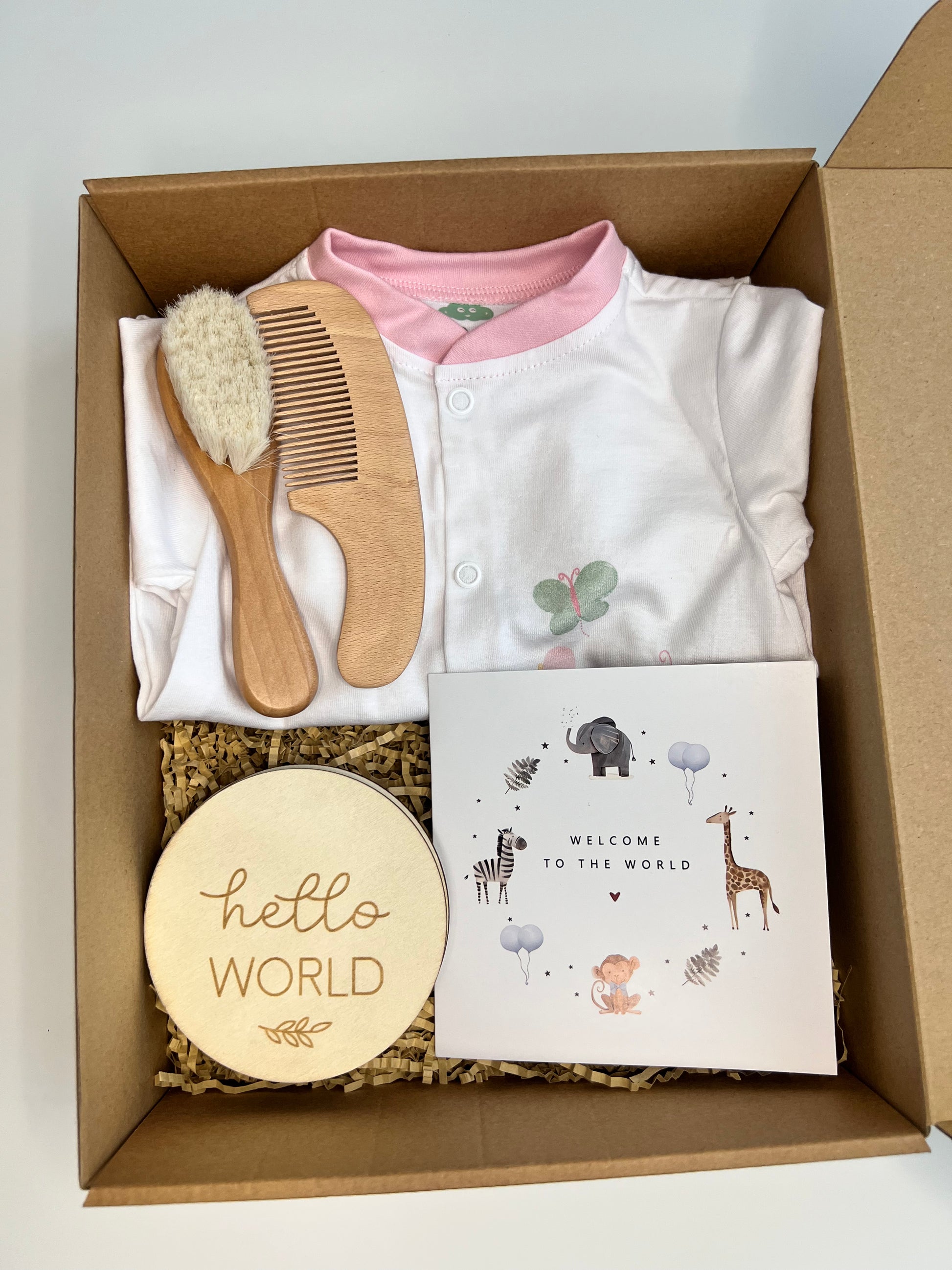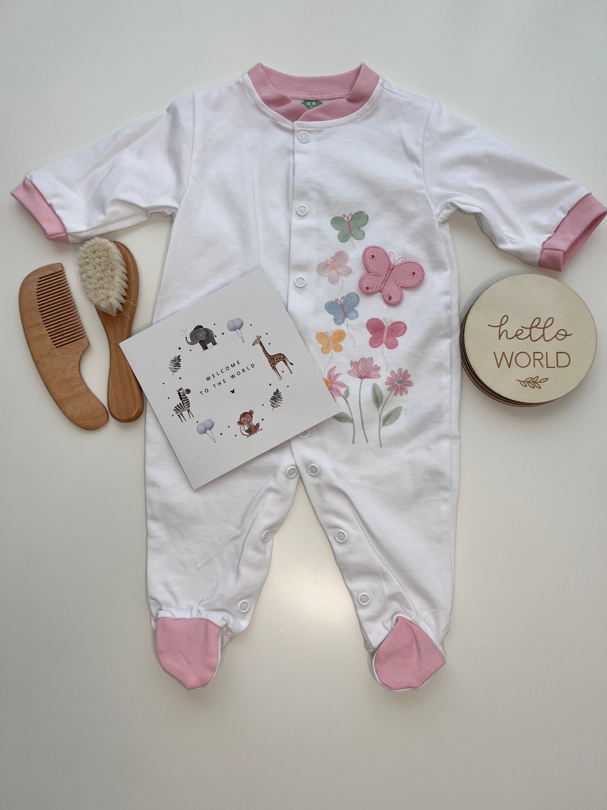 This beautifully curated box features a cozy organic cotton babygrow with a delicate butterfly print, along with baby care essentials – all thoughtfully arranged to make those first days extra special.