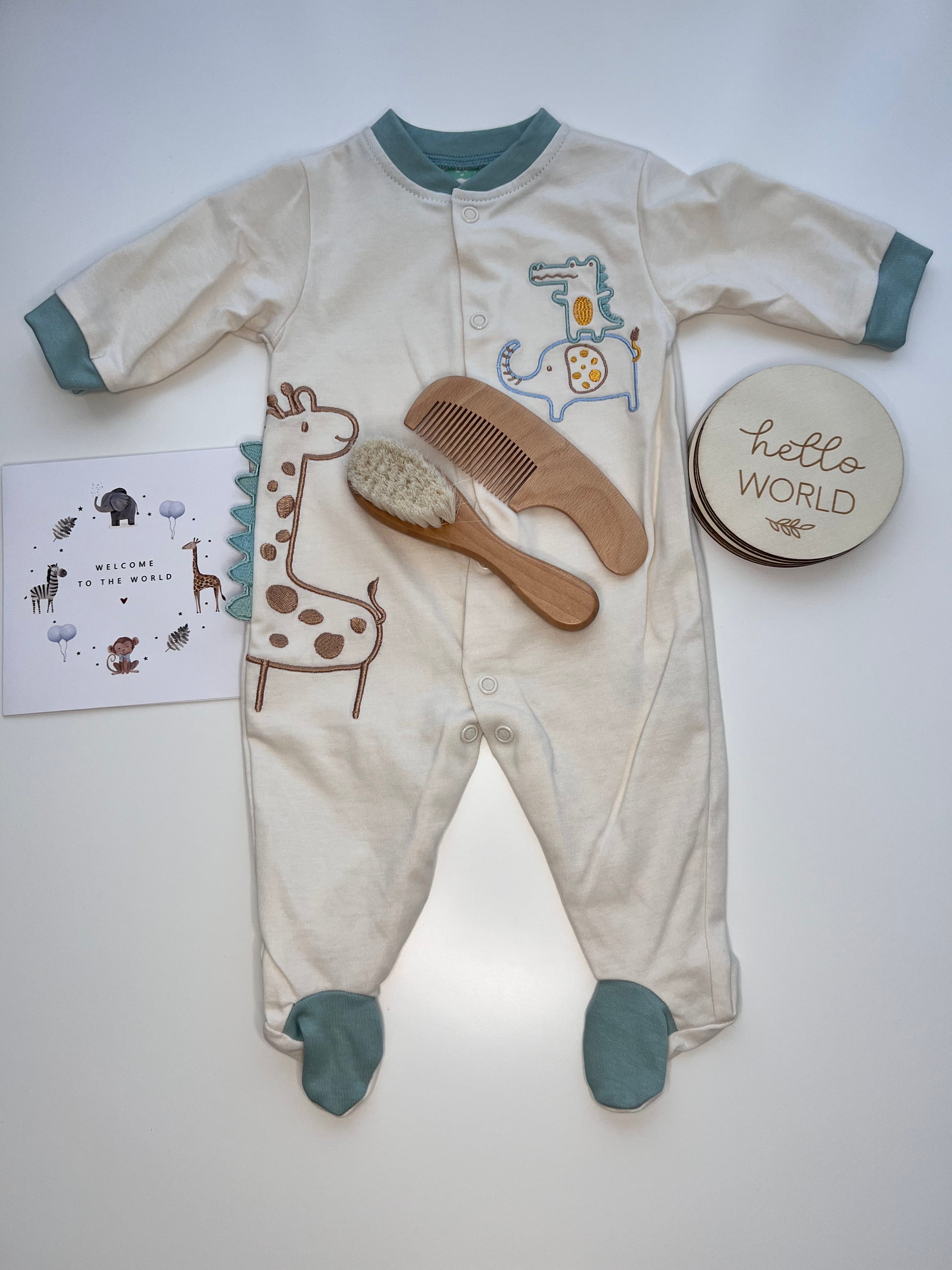 A playful and cozy newborn gift box that brings together soft organic cotton essentials and charming safari animal friends โ perfect for welcoming your little explorer with comfort and joy.